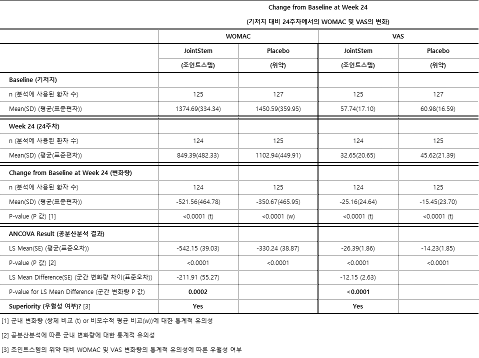 WOMAC의 경우 조인트스템 투여군 환자는 투여 전 평균 1,374.69점에서 투여 24주 후 평균 849.39점으로 521.56점이 감소(P값<0.0001)했으며, 위약 투여군과의 비교에서도 치료 효과가 통계적으로 유의미하게 개선(P값=0.0002)된 것으로 평가됐다.